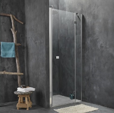 Une déco épurée pour cette petite salle de bain en béton gris aménagée avec sa douche italienne. La porte pivotante en verre transparent représentante un gain de place bien appréciable. Photo Leroy Merlin