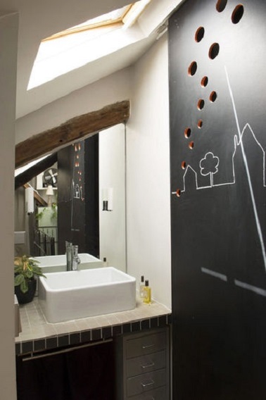 Une petite salle de bain mansardée nécessite un aménagement particulier. Ici, les rangements sont dissimulés sous le meuble vasque tandis que la cloison ardoise attire l’œil et apporte une originalité pratique puisqu’elle dissimule à la fois les WC et la douche à l’italienne. Et puisque le petit espace manque de profondeur,  un miroir coupé dans la forme de la pente disposé au-dessus du plan vasque permet de créer une illusion de grandeur et de volume.