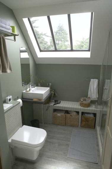 Si la petite salle de bain est aménagée sous les combles, elle n’est pas pour autant condamnée à être un espace réduit ! Cette salle d’eau de 4.5 m2 en donne la preuve. Lumineuse grâce au puits de lumière du toit elle optimise les astuces gain de place avec un plan vasque, moins encombrant qu’un meuble. Sous le rampant, un banc maçonné occupe toute la largeur et se prolonge dans la douche. Pratique pour un rangement salle de bain ordonné, les paniers en osier qui se glissent dessous. Le miroir face à la paroi de douche pour un effet d’agrandissement total de la salle de bain. Cuvette WC suspendu, mosaïque briquette 2,5 x 5 cm, sol vinyle imitation bois Porte de douche en verre chez Leroy Merlin.