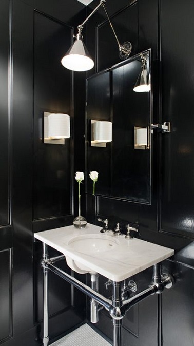 Cette petite salle de bain mise sur le duo noir et blanc pour un effet chic. Loin d'écraser la pièce, les murs noirs font ressortir les éléments qui composent la salle d'eau. Le meuble vasque est d’ailleurs mis en valeur tout comme l’espace disponible en dessous de ce dernier. La lumière tamisée quant à elle se charge d’achever cette déco tendance.