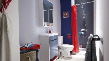 Des éléments rouge et une cloison bleue pour dynamiser une salle de bain toute en longueur. Photo : Leroy Merlin