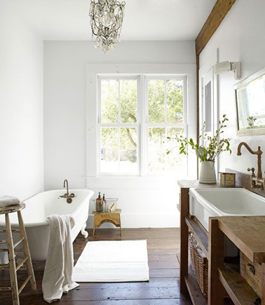 Le revêtement de sol idéal dans une salle de bain esprit rétro, c’est bien sûr le carrelage. Uni, posé en damier noir et blanc, ou avec des motifs dans les mêmes couleurs c’est le top. Autre style de carrelage compatible pour du rétro, la tomette, le carreaux de ciment à motifs. Un allié de choix pour créer une ambiance vintage, le parquet ! Si il est déjà dans la salle de bain, lui donner un petit coup de jeune peut être nécessaire mais après les réparations ou un ponçage éventuel. Ensuite vitrifier ou cirer le parquet dans une teinte foncée reste la seule chose à faire pour coller au style. Un tapis au centre de la pièce ou rapproché de la baignoire sera un petit plus si la surface de la pièce le permet.