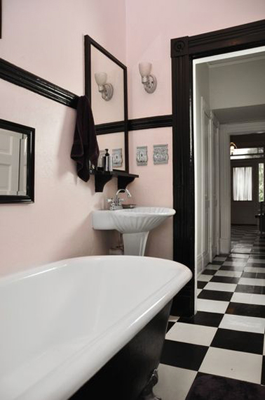 Les murs en rose pale et noir donnent un caché fou à cette salle de bain ancienne au style résolument rétro