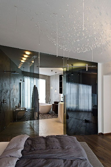 Amoureux du luxe et des grands espaces pour vous reposer, voilà une chambre pour satisfaire vos envies. Séparée de la zone réservée au sommeil par une cloison de verre fumé, l’immense salle de bain offre tout le confort dont vous rêvez. Pour vous relaxer, entre la douche italienne installée le long du mur en béton gris et la baignoire îlot posée sur un sol en galets, à vous de choisir. Source : Home Adore.