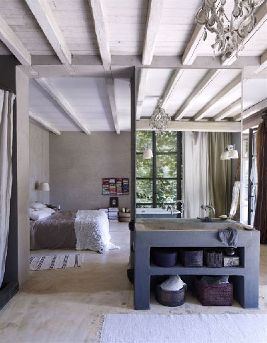 Située au rez de chaussée de la maison, cette chambre doit son charme aux baies vitrées ouvrant sur le jardin et à la dominante de matériaux naturels. Parquet clair, poutres et lambris du plafond blanchis avec un produit style badigeon Libéron, du béton ciré pour le plan vasque, le décor propice à une chambre cocooning est planté. L’espace dédié à la salle de bain est astucieusement séparé de la chambre par une cloison de la largeur du plan vasque, laissant de larges ouvertures de part et d’autre. Dans cette chambre, le point fort de la déco se pose sur le meuble plan vasque surmonté d’un immense miroir, alors que la douche, fermée par un rideau, est simplement considérée comme une fonction utile. Source : Home Adore.