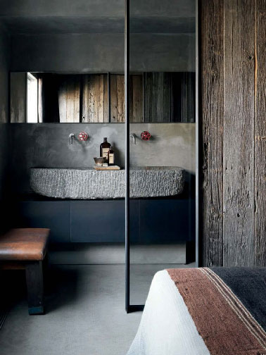 Chambre moderne, zen, rustique ? Entre les trois votre coeur ne balance pas. La décoration de cette petite chambre parentale réussit le pari de mixer les genres. Aménagée dans une ancienne grange, elle en conserve l’authenticité avec son mur de planches séparant l’espace lit de la salle de bain. Derrière la petite paroi de verre montée sur un châssis en fer forgé, le contraste entre le meuble noir aux lignes moderne et la vasque en pierre grise est sans conteste l’atout charme de cette chambre d’adulte. Source : Digs Digs.