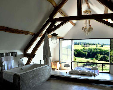 Aménagée dans le grenier d’une ancienne ferme en Bourgogne, une chambre 100% ouverte sur la nature. Installée sur une estrade d’une dizaine de centimètres, la tête de lit fait face à la large baie vitrée pour ne rien perdre du paysage. Au premier plan, la baignoire profite de l’intimité apportée par les pentes du plafond pour proposer un espace zen à souhait. Source : Desire To Inspire.