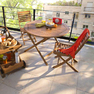 Un petit mobilier parfait en bois chaleureux pour aménager un salon détente sur le balcon. ©Castorama