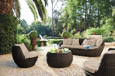 Le romantisme et le confort dans le jardin avec ce salon de détente en résine familial. © Maison du Monde