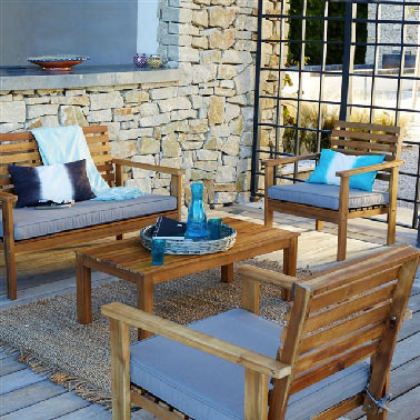 De structure classique, ce salon de jardin chaleureux en acacia est une valeur sûre en déco extérieure ! L’aspect très chaud de ce bois se marie à merveille avec les assises carrée profondes dotées de coussins gris bleuté qui donnent à ce coin salon extérieur un côté plus tendance et confortable à la fois. Les nuances dorées du mobilier illuminent toute la terrasse et donnent un réel aspect estival à tout l’extérieur pendant que quelques accessoires déco déclinés dans un camaïeu de bleu viennent vivifier cet espace de convivialité. La Redoute – Salon de jardin en acacia massif. Prix banquette : 359,50 euros.