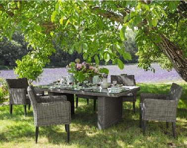 Quand le salon de jardin joue la carte de l’aménagement champêtre, il ne peut que séduire ! Idéal pour les grands espaces de verdure, ce salon de jardin en résine de chez Maison du Monde adopte un design épuré qui se fond élégamment dans le décor naturel ambiant. De part son revêtement en résine, cet ensemble de mobilier de jardin est robuste et résiste aux rayons du soleil. La couleur gris de ce salon de jardin offre la modernité pendant que les coussins clairs sur les fauteuils apportent la note de fraîcheur et de confort. Une grande table avec un support verre sur le dessus pour pouvoir dîner en famille, et l’on voit déjà se profiler des week-ends agréables à l’ombre d’un arbre ! Maison Du Monde – Fauteuil en résine tressée et coussins gris clair à 169,90 euros.