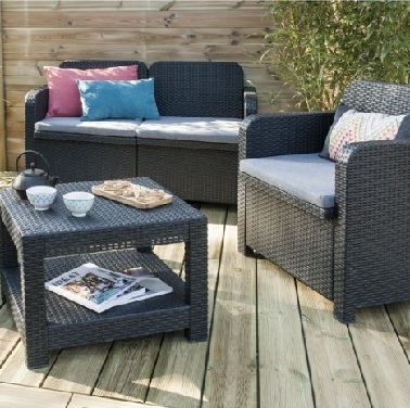 Ce salon de jardin mise tout sur un look intemporel et subtil. Adoptant la couleur gris anthracite, ce mobilier souligne l’aspect moderne de tous les extérieurs tout en ne négligeant pas le confort grâce à ses assises en mousse confort clairs. Faits en résine injectée, ces meubles de jardin se révèlent être très résistants et robustes afin de vous assurer une tenue longue durée. Une esthétique simple et géométrique rehaussée par quelques petits coussins de couleur qui égayent tout le coin salon. De quoi looker son extérieur à prix tendre ! – Leroy Merlin – Ensemble salon de jardin 2 fauteuils, 1 canapé deux places et table basse à 159 euros.