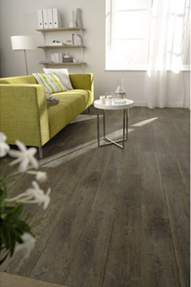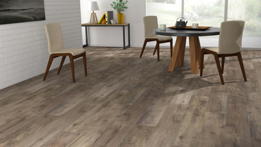 Lames PVC aspect parquet lasuré gris dans salon salle à manger