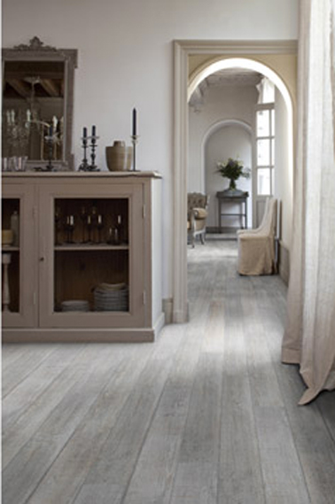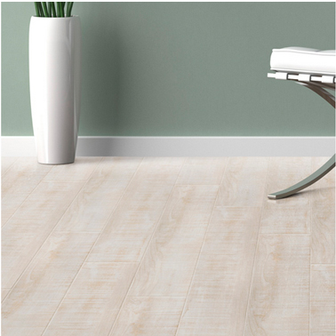 Son aspect mat et les bords de lames chanfreinées donnent l’illusion d’un vrai parquet blanchi. Se pose dans les pièces au passage important tel que séjour, salle à manger, chambre. Longueur de la lame 91.4 cm. Largeur de la lame 15.2 cm.  Lame vinyle adhésive 6′ Senso Rustic 3DS Kola Gerflor. Prix : 19.90 € le M2 chez Leroy Merlin.