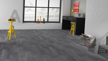 Imitation bluffante d'un sol béton esprit loft avec ce sol PVC lames auto-collantes couleur gris béton chez Saint Maclou