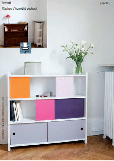 Peinture pour le meuble : couleur Écorce de bouleau. Couleur peinture pour les portes : Mandarine, Fuchsia, Feutrine, Genévrier, collection Poudre Suprême® de Tollens