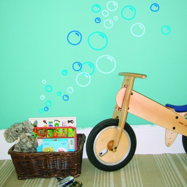 Un fond bleu et des bulles. Immédiatement ces stickers évoquent le monde marin. Disposés en sous bassement d’un mur peint dans une nuance de bleu, ils permetttront de recréer dans la chambre l’ambiance d’un monde sous l’eau. Composées de grosses et de petites bulles, il est possible de personnaliser la déco à l’infini et de faire évoluer les bulles de bas en haut ou de haut en bas au gré des envies. Pour que l’enfant puisse également profiter de la décoration de sa chambre, il est préférable de disposer ces stickers en bas de murs au plus près de leur perception. Après cela aucun doute, les bambins se sentiront comme des poissons dans l’eau ! Stickers Berceau Magique.com : 23 euros.