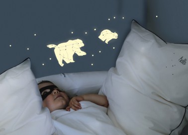 Loin des célèbres Baloo et autres Winnie l’ourson, ce sont de vrais ours qui s’illuminent dans la chambre d’enfant grâce à l’effet phosphorescent des stickers. Le nez dans la voie lactée, une fois la nuit tombée, le mur décoré révélera son vrai visage : les ours blanc de la journée ne sont autres que des constellations visibles uniquement la nuit. Un sticker pour une imagination sans modération ! Mimi’Lou Shop : 29 euros.