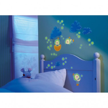 Les stickers phosphorescents et colorés viennent enchanter les nuits des petits. Des petits clowns vert orange et bleu voyagent à travers les étoiles. Disposée au dessus de la tête de lit, cette décoration murale mignonne et apaisante accompagnera l’enfant au pays des rêves. Quiétude assurée. Mimi’Lou : 16,90 euros