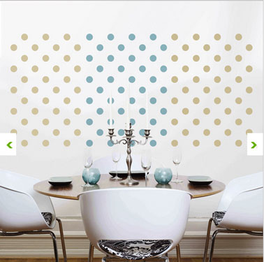 Le même pochoir en version couleur pour une autre ambiance. Ref : pochoir taille L, gros pois. Prix à l’unité : 35.90 € Leroy Merlin.