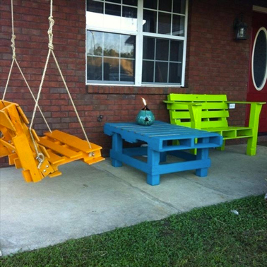 Super look pour un ensemble table basse banquette et balancelle fabriqué avec des palettes en bois et peint dans des couleurs popMême une balancelle en palette peut se fabriquer ! Pour alléger son poids, on ôte deux des traverses du dessous des palettes puis on fixe assise et dossier à l’aide de tirefond après avoir peint les palettes. Les cordes de la balancelle sont fixées en quatre points en prenant soin de faire filer la corde sur le dossier pour qu’elle est deux points de soutien. La table basse est fabriquée avec une palette laissée entière pour faire office de plateau tandis que les pieds sont réalisés avec des tasseaux de bois de 6 cm de section.