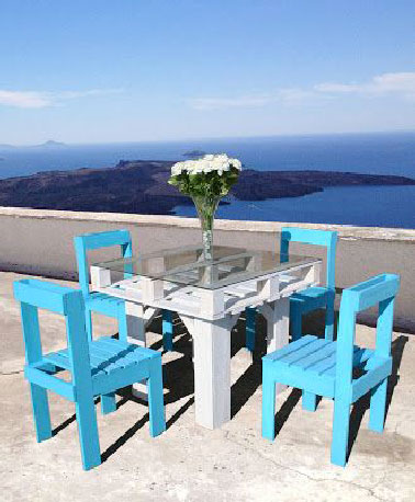 Un salon de jardin en palettes bois qui affiche fier allure sur la terrasse avec un beau contraste de vert et bleu
