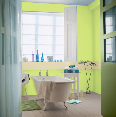Ici, une salle de bain aux couleurs acidulées avec une peinture d’un vert turquoise et pistache Peinture Astral
