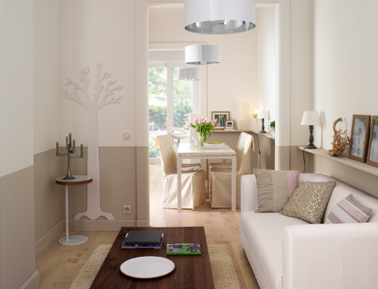 Très tendance pour la déco du salon aussi, on brise maintenant la frontière entre extérieur et intérieur. La nature s’invite dans la maison avec une belle harmonie de couleurs entre blanc cassé, lin, et beige taupe introduites avec les deux tons de peinture pour faire écho aux couleurs tendres des accessoires de décoration. Peinture haut mur : Couleur lin. Soubassement : couleur beige taupe Luxens Leroy Merlin.