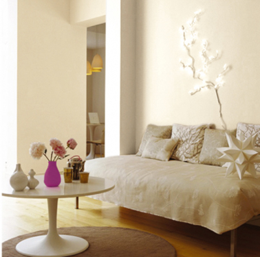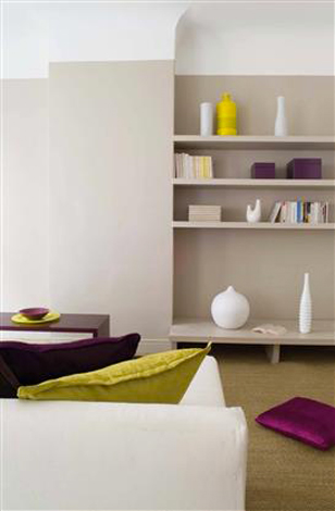 Dans ce salon, la couleur lin recouvre les murs et en profite pour intégrer les étagères de la bibliothèque de la même couleur. Pour donner du tonus à un salon contemporain, on apporte en touches de couleurs vives avec les objets déco, coussins, vase couleur prune et jaune vif. Apporter des couleurs toniques avec les accessoires déco, une astuce qui permet de conserver la base neutre que pose la couleur lin sur les murs et lorsque l’envie nous prend de modifier l’ambiance dans le salon, il suffit de changer la couleur des accessoires. Photo : Dulux Valentine