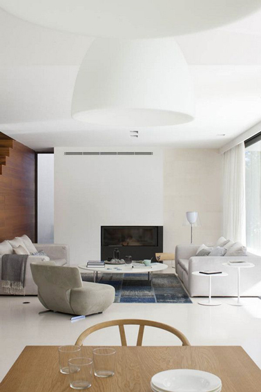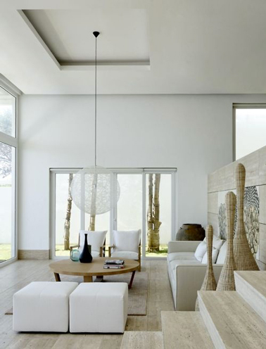Dans ce salon design décoré en total look avec des couleurs naturelles et baigné de lumière, murs et plafond se couvrent d’une peinture couleur lin un peu plus claire que celle du carrelage en pierre naturelle. La nuance intermédiaire du canapé cuir est mise en avant par les coussins et fauteuils blancs. Malgré son style épuré et sa dominante de couleurs hyper claires il se dégage une atmosphère très confortable grâce à l’équilibre et à la sobriété des lignes.