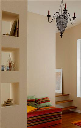 Pour repeindre les murs de vos différents différents volumes ouverts, avec la dominante de couleurs naturelles existante, deux options : Vous restez dans la même harmonie avec par une peinture dans les tons ficelle ou lin soutenu et relevez le tout avec des touches de couleurs plus pep’s ou noir avec les accessoires. L’autre piste c’est d’introduire une couleur chaude en contraste sur un ou deux pans de murs en fonction de la distribution des pièces, ou sur des piliers, tel un jaune oranger ou un vert pétillant qui viendrait dynamiser les autres murs peints en lin soutenu. Pour les murs de l’espace mezzanine, une nuance de blanc serait préférable à un blanc pur pour avoir une transition entre les volumes plus coulée.