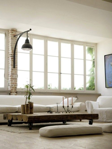 Pour profiter au maximum de l’atout de la grande baie vitrée, lorsqu’il a fallu transformer cet ancien atelier en salon convivial tout en gardant une empreinte de son passé industriel, les couleurs et matériaux naturels s’imposaient presque. Les murs et sol sont recouverts de peinture et revêtements en dégradé de tons lin de clair à moyen. Au sol, parquet, tapis et coussin les teintes en ton sur ton s’individualisent par la différence des matériaux. Les canapés en cuir blanc se distinguent des murs par un effet de contraste apporté par la table basse en bois fabriquée par un artisan pour l’occasion et le ton plus soutenu de lin retenu pour peindre le soubassement.