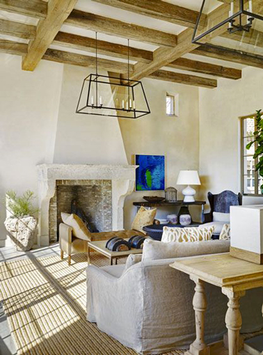Peindre les murs d’un salon d’une maison de campagne avec une belle et neutre couleur lin est bien la meilleure façon de mettre en valeur l’architecture de la pièce et ses poutres apparentes et d’en accentuer la luminosité qui souvent fait défaut dans les demeures anciennes. C’est le cas dans ce salon où la teinte lin est travaillée en total look du sol au plafond. Les nuances de bleus dans le coin du salon apportent une touche de modernité à un ameublement et une décoration volontairement éclectique.