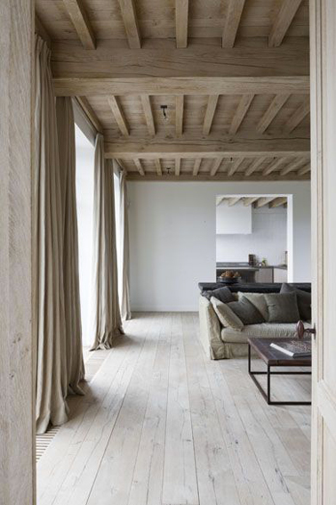 Dans ce grand salon aux murs gris perle et au style épuré, la couleur lin des rideaux se cale ton sur ton avec la couleur du plafond plancher. Le sol en parquet chêne blanchi révèle l’aspect chaleureux du coin canapé décliné en dégradé de lin, gris et taupe. Pour renforcer cette harmonie couleurs et matériaux naturels, les portes et huisseries ont été décapées et traitées avec une lasure légérement teintée blanc.