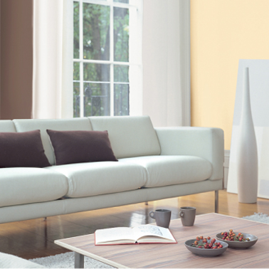Sur la base de beige, vous pourriez choisir une peinture salon dans une couleur de jaune oranger, et comme votre salon est lumineux vous pourriez exploiter cet avantage en prenant un ton plus soutenu pour l’un des murs et pour mettre en valeur le beige et le orange, pensez au rouge pour les éléments de décoration et à quelques touches de vert tendre.