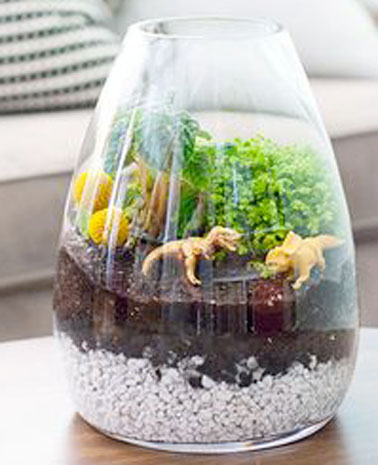 Un terrarium en verre avec un paysage de plantes plus enfantin pour attirer l'oeil. Un objet déco original, avec des dinosaures, une forêt amazonienne qui plaira autant à l’enfant qu’à l’adulte.