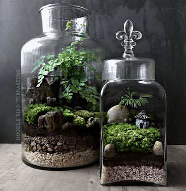 Plus qu'un mini jardin d'intérieur, le terrarium est un écosystème miniature dans un bocal en verre où on retrouve des plantes , des cailloux, de la terre pour un élément déco original.