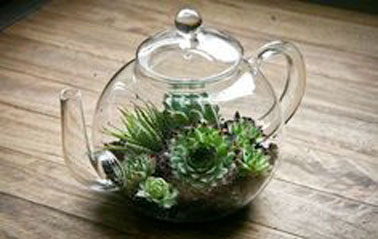 Un terrarium dans une théière en verre avec couvercle, et son petit jardin de plantes.