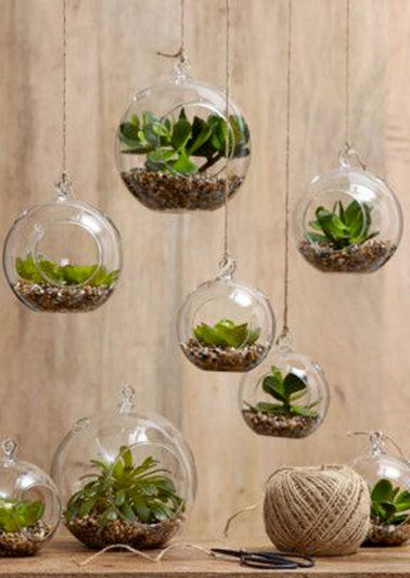 Des terrariums composés de gravier et de plantes suspendus à l’aide d’un fil pour une touche nature dans une déco intérieure. Attention à la lumière pour les plantes.