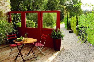 Même rainurage pour le bois de cette petite terrasse mignonne comme tout et protégée du vent par une claustra bois peinte en rouge vif pour bien se faire remarquer au milieu de la verdure qui l’entoure. Dimensions des lames en pin naturel 240cm x l.12cm x ép.28mm, prix : 7.63 € l’unité : Leroy Merlin.