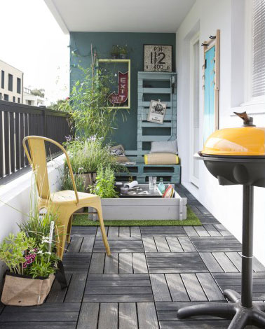 Sur une terrasse en ville et en longueur, pour recouvrir le carrelage souvent en place dans les résidences, le bois composite en dalle façon caillebotis est une solution pas chère et facile pour changer d’ambiance déco. Avec ces dalles composite emboîtables, on peut en profiter pour intercaler des carrés de galets ou encore plus simple, apporter un peu de verdure avec du gazon synthétique en guise de tapis sous la table de jardin. Planche compo clip en composite couleur gris Natérial, L 120 x l 15 x Ep 36 mm. Prix : 9.90 € l’unité.