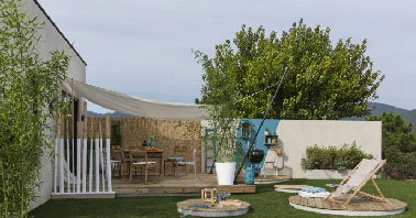 Une déco de terrasse de maison de campagne aménagée avec un accès direct depuis le salon. De bonnes dimensions et prolongée par 2 petits îlots en bois pour les bains de soleil dans les transats, cette terrasse en bois abritée du soleil par une voile d’ombrage, est composée de lames en pin massif rainuré pour diminuer les risques de glisse. Les lames se montent sur une dalle béton et lambourde. Disponible en finition blanc, beige et bois naturel. Planche Kiméo en pin naturel, L 240 x l 12 cm x Ep 27 mm Prix : 3.90 € l’unité : Leroy Merlin.