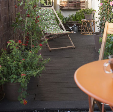 Ambiance déco very cocooning sur cette terrasse en bois aménagée avec des dalles en composite pour y placer le salon de jardin. De la brande pour protéger la terrasse de la vue des voisins, du rotin, du bois deci-delà, quelques plantes et la terrasse se fait oasis de verdure. Dalle clipsable Easy en polypropylène noir, L 38 x l 38 cm x Ep 25 mm à poser direct sur le sol, Prix : 4.55 € pièce.