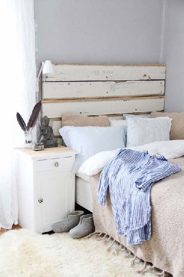 En parfaite harmonie avec les couleurs pastel de la chambre, la tête de lit est ici composée d’une palette désossée pour récupérer les traverses qui sont ensuite fixées sur des tasseaux. Pour obtenir l’effet bois peint usé, peindre les traverses de la palette en blanc cassé et après séchage complet, poncer le bord des traverses à l’aide de papier de verre. Terminer en fixant la tête de lit sur le mur. Source : NIB.