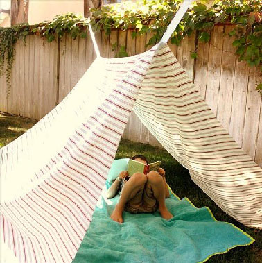 Près de la piscine, dans le jardin, qu’importe ! Cette tente ne demande que 2 supports pour prendre forme. Poteaux de clôture, branche, pour y nouer la bande de coton plat cousue sur une pièce de tissu de 150X350cm. Une toile à rayures ajoute une note note colorée à la décoration au jardin qui ne s’en plaint pas. Remplace les bains de soleil traditionnels autour de la piscine par plusieurs tentes comme celle-ci, un façon de revisiter l’ambiance de son extérieur. Pinterest.