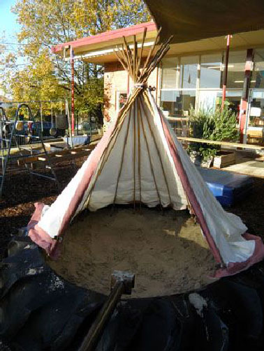 l’idée est au top et on se demande comment on y a pas penser ! Protéger le bac à sable par un tipi largement ouvert, une bonne façon d’offrir aux enfants à possibilité de cumuler les joies de la vie extérieure. Ici les poteaux du tipi sont fixés dans un pneu d’engin agricole qui sert de bac. L’idéal est de rapprocher les piquets afin de laisser une large ouverture au tipi. New Nist.com.