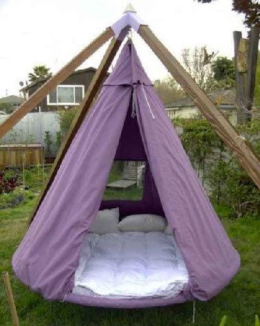 Se prélasser dans le jardin en se balançant au gré du vent, voilà le plaisir que propose ce tipi pour le moins confortable. Construit avec une base de trampoline de récup, habillé d’une toile, il est suspendu à une structure bois faite maison. Recouvert d’un douillet duvet et de coussins, les heures de détente à l’extérieur sont assurées. A installer non loin de la maison pour garder un oeil sur les enfants et piquer leur place à la première occasion..