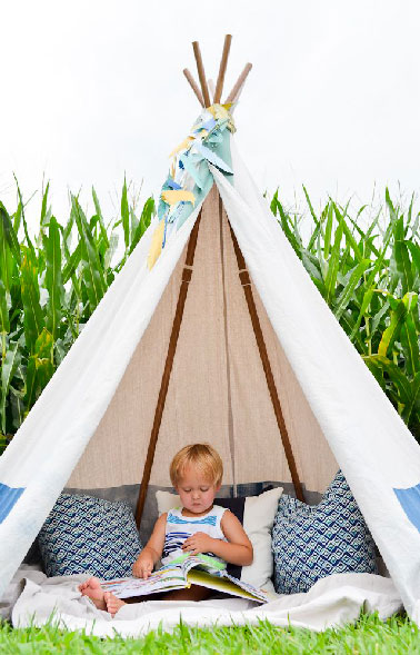 Pour passer l’après-midi au jardin sans craindre le soleil, un tipi en toile blanche largement assez grand pour se détendre et s’amuser à plusieurs. Les supports sont fabriqués avec des tubes PVC. Pour le confort, le sol est couvert d’un duvet et de tout plein de coussins. A l’extérieur de la toile et au sommet, une décoration légère faite de carrés de couleurs et de plumes lui donne un style de vraie tente d’indien. A chacun bien sûr de personnaliser son tipi comme bon lui semble pour qu’il s’intègre à la déco du jardin ou, comme ici prenne une allure ludique pour la grande joie des enfants. Project Nursery. com