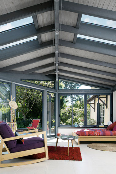 Pourquoi ne pas aménager la chambre parentale dans la véranda pour obtenir plus de luminosité ? Complètement ouverte sur le jardin cette chambre ne manque pas de charme