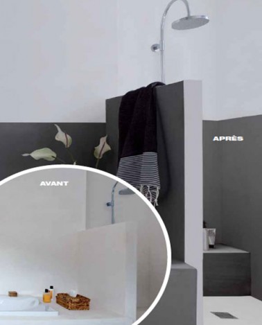 Hydroactiv’ pour peindre douche et murs de salle de bain est une peinture acrylique (à l’eau) qui s’applique en deux couches sur supports bruts comme le plâtre, les carreaux de plâtre et les supports déjà peints avec une peinture acrylique ou glycéro.
